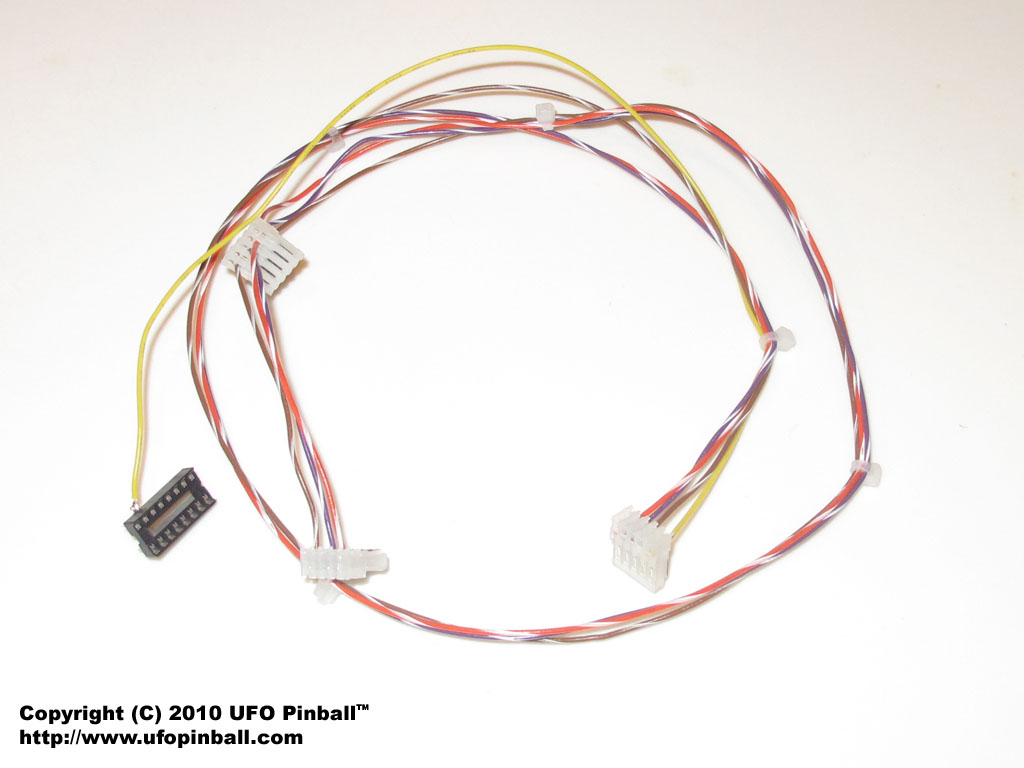 1) Install the AFM-Expansion board by removing the two left-hand screws on the AFM-LED board, and fitting the AFM-Expansion board behind it, then replacing the screws. The boards will share these two screw holes. ![]() 2) The Power Wiring Harness is about 1 foot long, with Grey (+5v), Black (GND) and Yellow (+12v) wires: ![]() Install the Power Wiring Harness by connecting it to any one of the 4-pin power connectors (lower right corner, they are all the same), and plug the other end into J138 on the Power Driver Board. Move the existing AFM-LED power connector from J138 and plug it into an open 4-pin power connection on the AFM-Expansion board. This leaves one additional 4-pin power connector for future expansion. 3) The GI Wiring Harness is the one with Green and Purple wires, and the heavy-duty black IDC connectors: ![]() Starting with the end with the two six-pin connections, plug the header with only two wires into the bottom 6-pin connector (J14) on the AFM-Expansion board. The other one with five wires goes to the upper 6-pin connector (J13). The other end is a little more complicated. On the Power Driver Board, unplug the backbox GI connector from J105/J106 and plug it into the Z-connector of the GI Wiring Harness (the male connector). Plug the remaining end of the GI-Wiring Harness into J105/J106. 4) The "J110" Wiring Harness is about three feet long with a 16-pin black socket attached: ![]() The end with two IDC plugs goes towards the Power Driver Board. Remove the current J110 connector and plug in the new wiring harness. Connect the old J110 connector to the Z-connector on the wiring harness (the male connector). Connect the remaining IDC connector to the middle connector (J18) on the left-edge of the AFM-Expansion board. 5) The 16-pin socket connects to the AFM-LED board. Gently remove the U4 chip (74HCT138) and install the 16-pin socket in the U4 location with the yellow wire on the bottom, facing left. Re-install the 74HCT138 chip into the new 16-pin socket. Chapter 1: Preparing your game Chapter 2: Installing the board and connecting the cables Chapter 3: Wiring up the Super Jets and Attack Hallway LEDs Chapter 4: Installation testing and jumper settings Chapter 5: Troubleshooting |