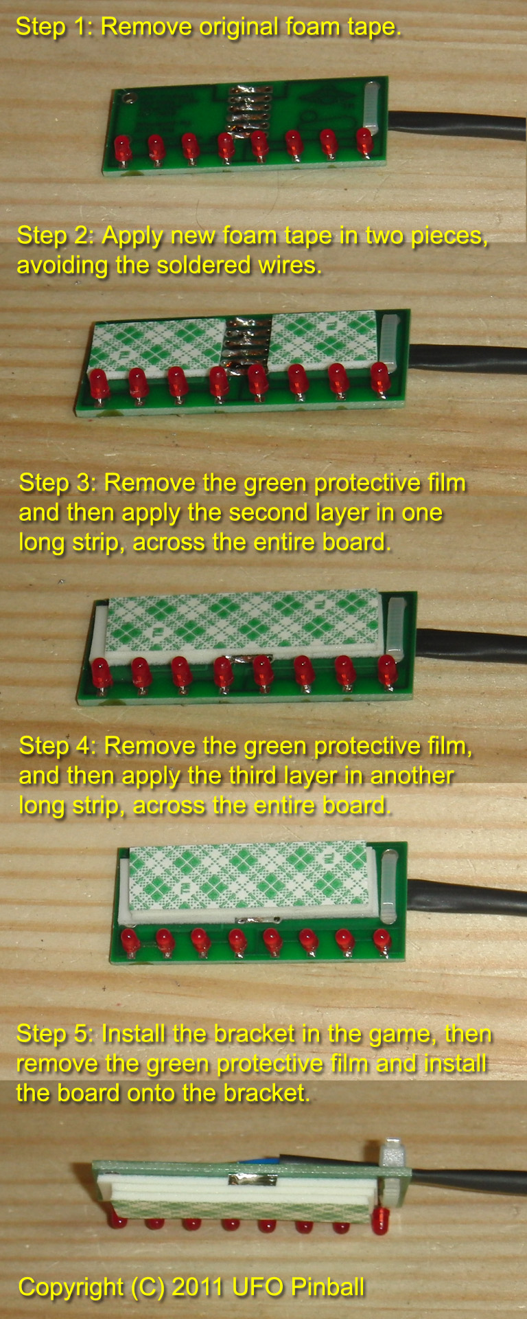 January 5, 2011 I have gotten reports that the LEDs stick out too far and can get hit with the ball. Repeated hits with the ball may cause the LEDs to break. The solution to this is to add more layers of foam tape to move the LEDs further into the metal bracket. To do this properly, you should get the large flathead screwdrivers from the original AFM-LED kit ... or, I actually use the "feet" of one of the old brackets. Gently pry the board apart from the metal bracket so as not to break any of the LEDs. Start with the area closest to the LEDs, or the sharp angle will put pressure on the LEDs causing damage. Once you have the parts separated, remove all the existing foam before applying new foam. If you are having trouble, a little heat will help soften up the glue.