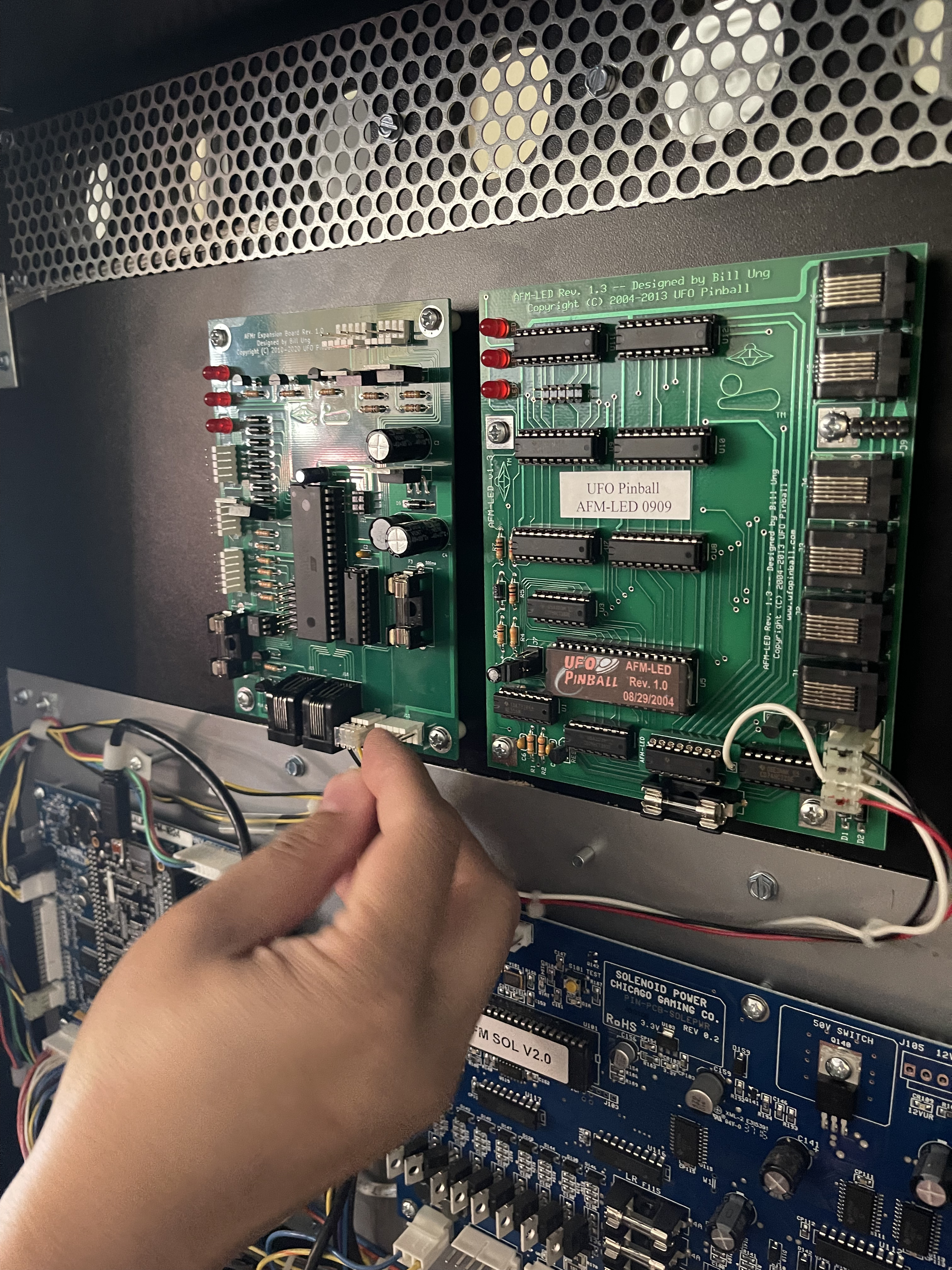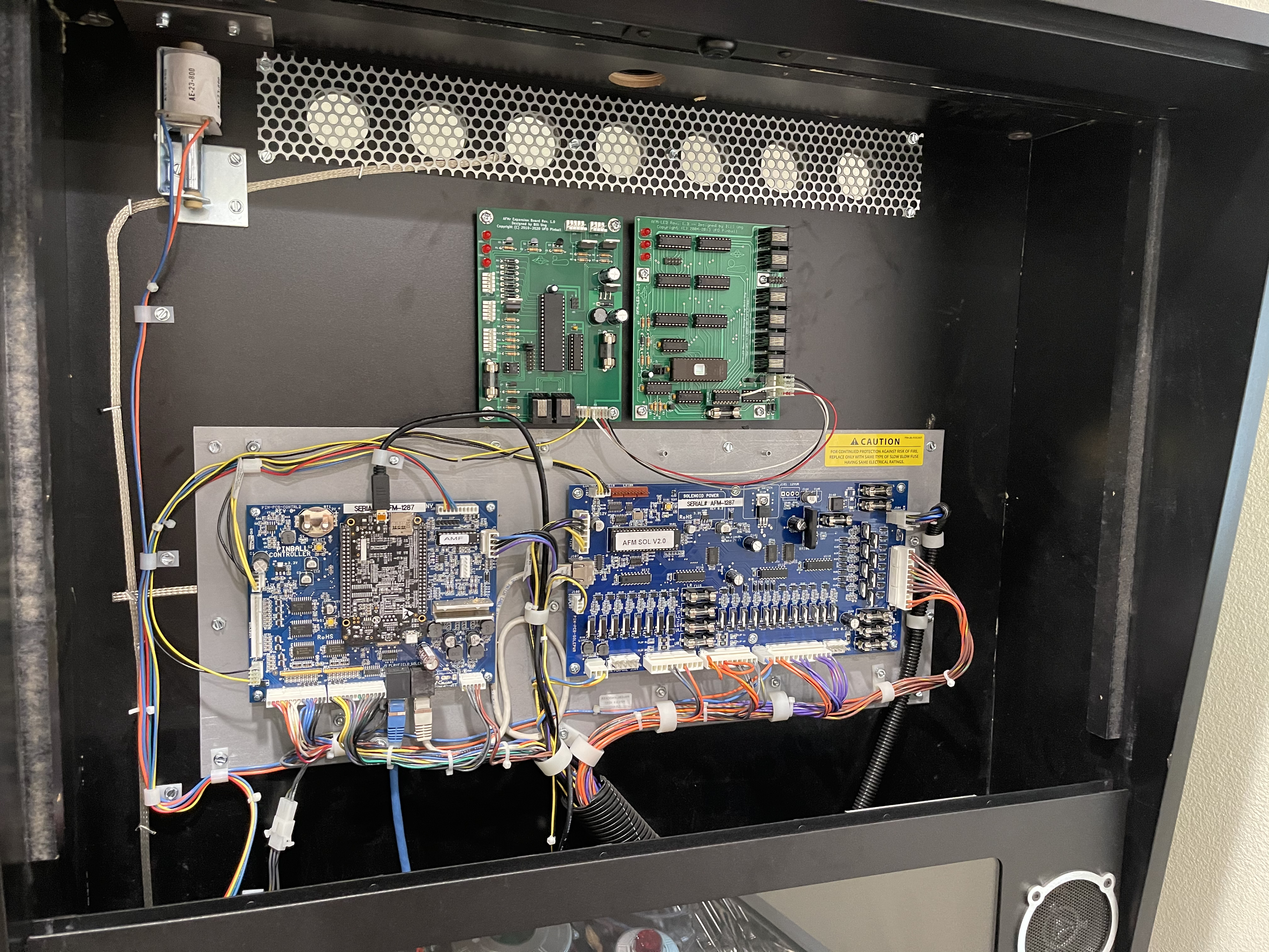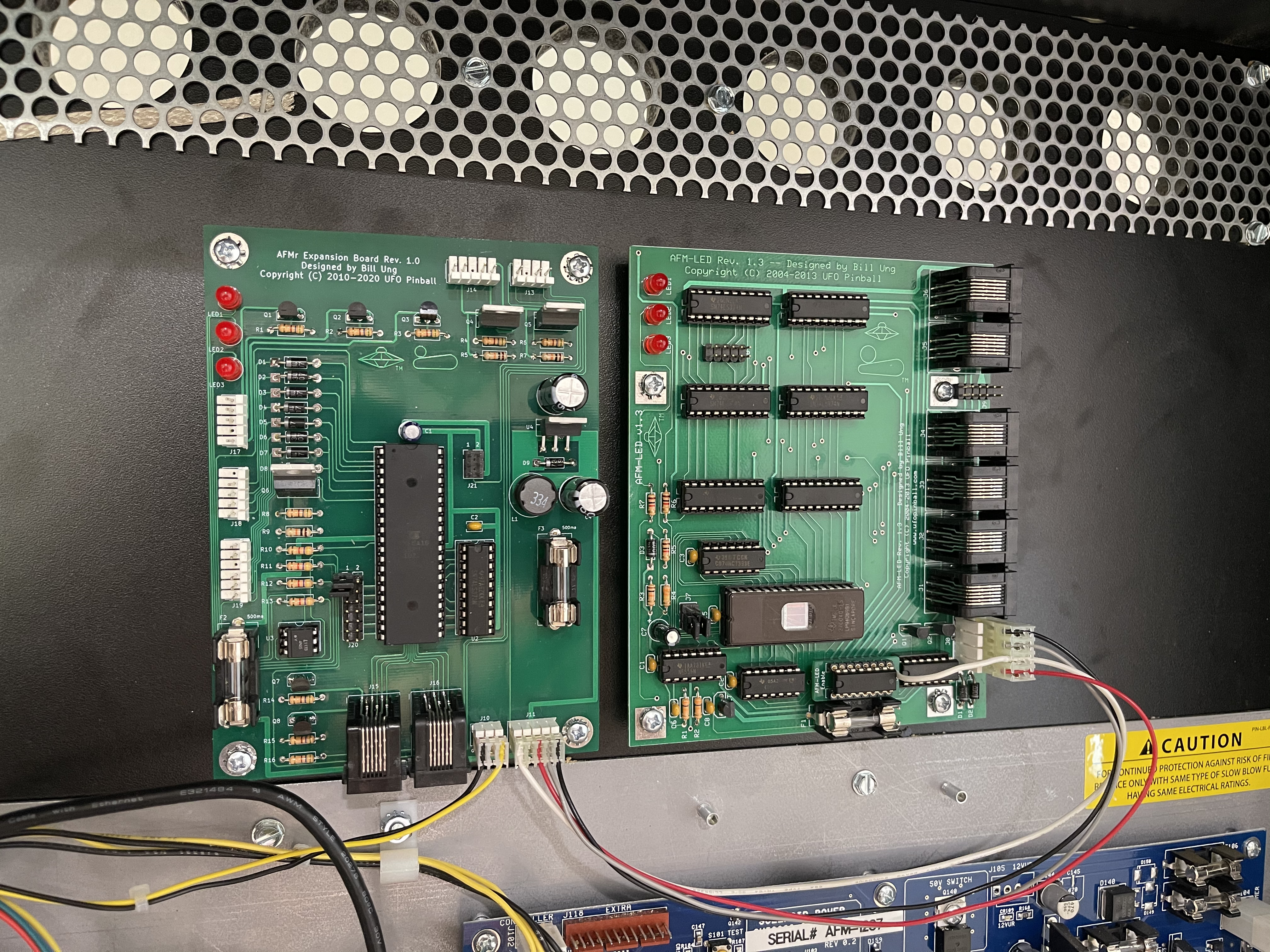 The AFMr boards are installed into the upper backbox area. This shows both boards installed, so if you ordered a different configuration, you may skip over anything that does not apply to your installation.