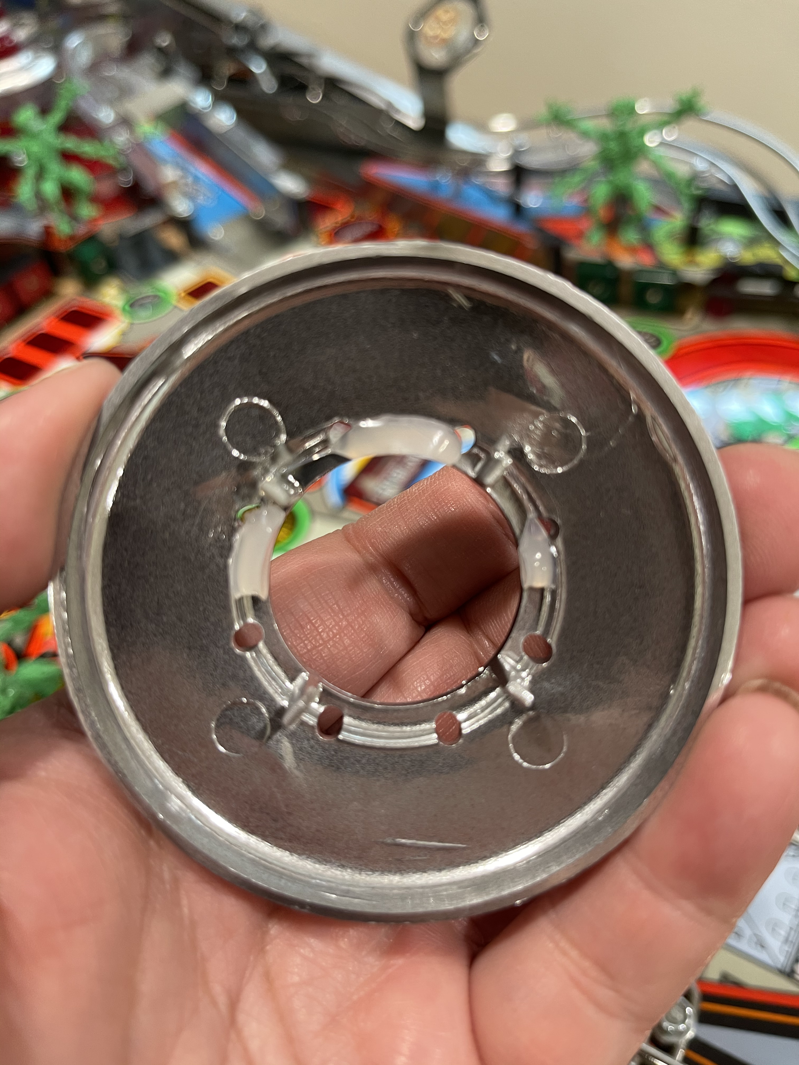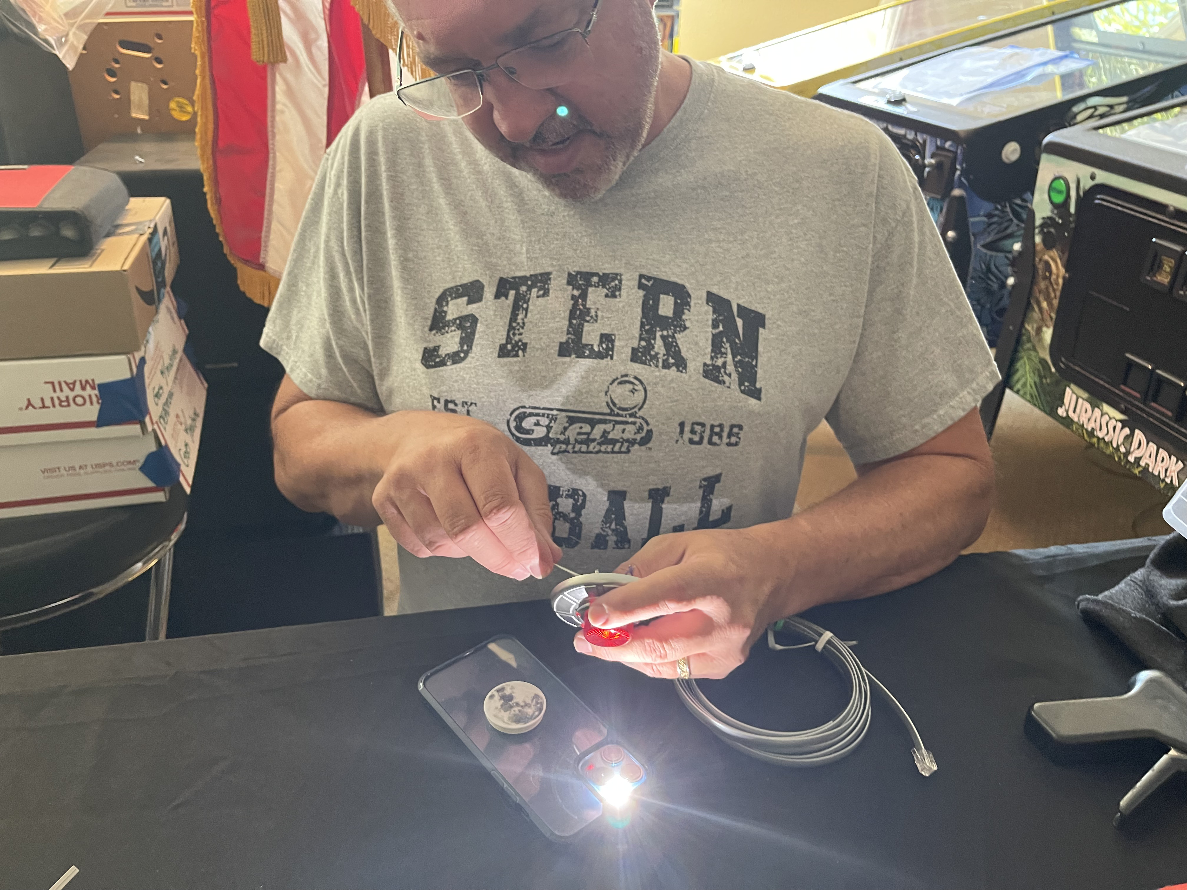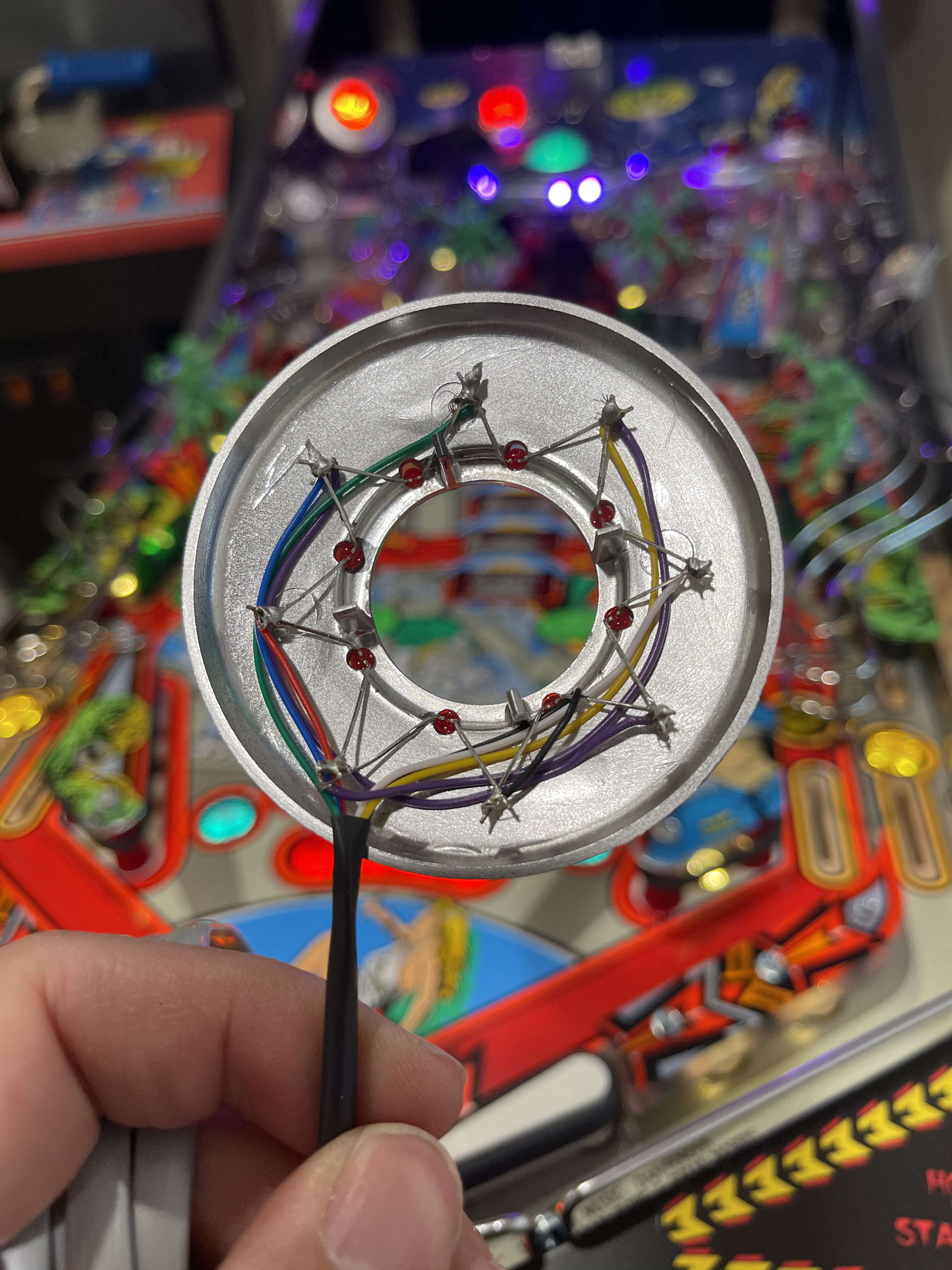 Our next step is to work on the saucers. I suggest removing all six saucers from the game, and taking them, the supplied saucer units, and the mini-screwdrivers ... and then finding a comfortable chair. You do not need to be by the game to perform this step of the installation. The underside of the AFMr saucers may have hot glue blocking some of the holes. This will need to be removed. Some of the silver paint may come off, so be as gentle as you can be, or maybe just drill holes through the glue. Chuck Casey found that shining a light from the underside can help you line up the LEDs. The LEDs are designed to fit snugly into the holes and should be held in by friction. No adhesive should be required. The entire unit expands a little to fit around the red flasher dome. Using the small jewelers flat-head screwdriver, insert each LED into the corresponding hole, and push until they are firmly seated. Repeat for all six saucers. If you have some hot glue (or suitable replacement) handy, it's worth adding some adhesive back to keep the saucer plastic from riding up on the flasher dome. The LED-units may have become slightly misshapen during shipping ... if so, you should reshape the LEDs into a circular pattern before proceeding. Be careful with the LED units, some of the solder joints may be a little sharp. After the lights are installed, bend the legs and solder joints in to lay back flush against the underside of the saucer. If they stick out too far, they may short against some of the metal hardware of the game. Once you have completed all six saucers, it is probably worth testing them to ensure that nothing was broken during installation. You can power-up the game and plug each saucer into the board, one at a time, to test that all the lights are functioning. The opening animation is a simple sequence that cycles through all the LEDs. You can see a sample of the sequence as the first animation on the Features page. When you are finished testing your saucers, turn off your game before moving on to the next step. Chapter 1: Tools and preparation Chapter 2: Mounting the board(s) and connecting power Chapter 3: Inserting LEDs in the Mini-Saucers Chapter 4: Installing the mini-saucers back in the game Chapter 5: Setting up the Hallway LEDs Chapter 6: Running wiring harnesses under the playfield Chapter 7: Connecting the Backglass GI Chapter 8: Testing and jumper settings Chapter 9: Troubleshooting |