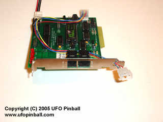 Close-up of the saucer coupler connections (Click to enlarge) Route the extension cords in the same fashion as the signal wiring harness. Feed the cords up the back wall of the game and up the left side of the head (right side to you, if you are behind the game). The cords should easily reach the RFM-LED board. The #1 saucer cord goes in the top plug, and the #2 saucer cord goes into the bottom plug.