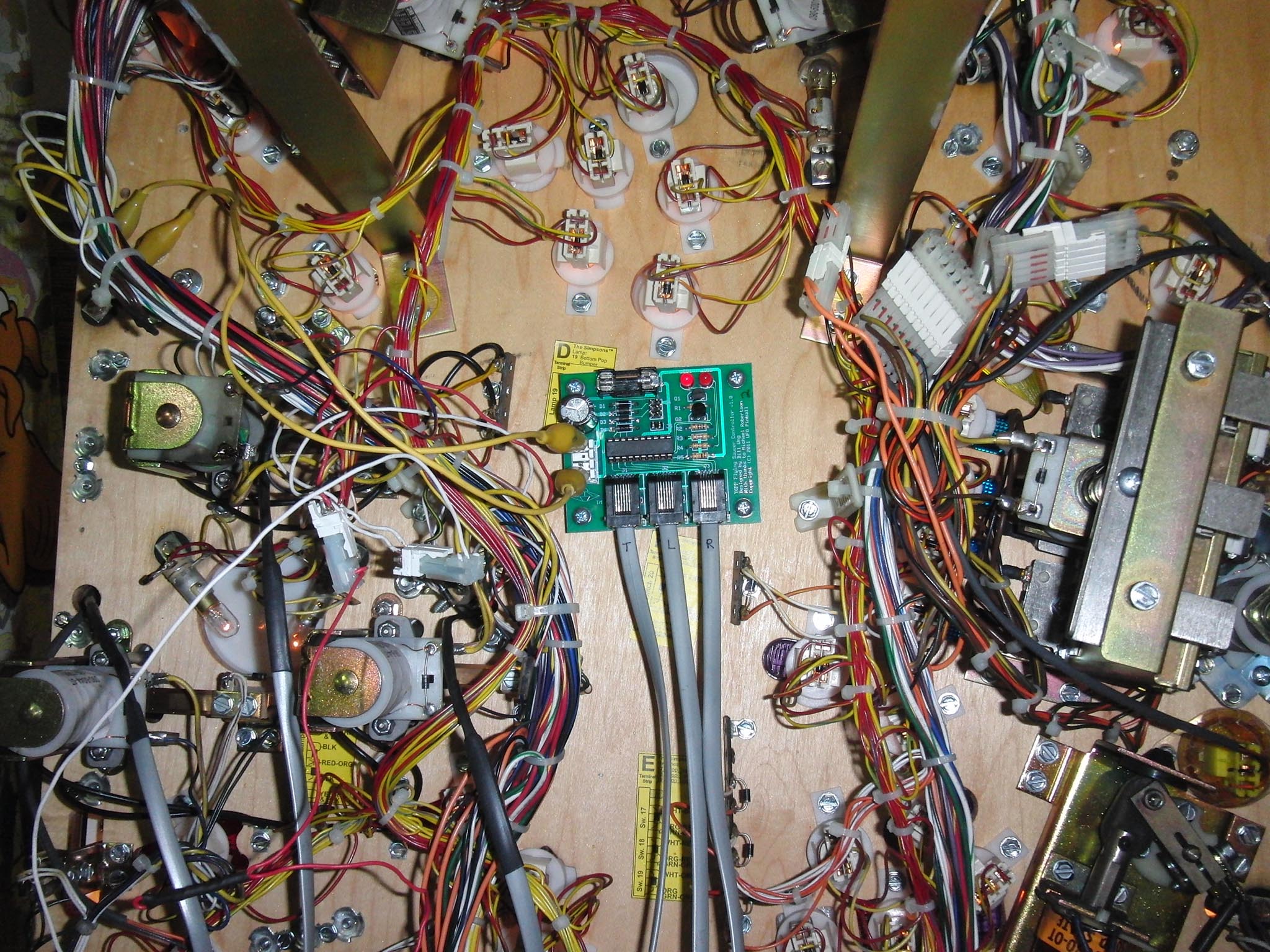 The above picture is from TJ Beyer's game at the Pin-a-Go-Go in 2011 and does not include a proper power wiring harness. The finished product will include a wiring harness and bare wire connections on the end. The alligator clips were for testing purposes, you will need to actually solder the wires to ensure stability in a high vibration machine. You may solder the wires to any GI lamp, click on the picture above to see where we connected ours.